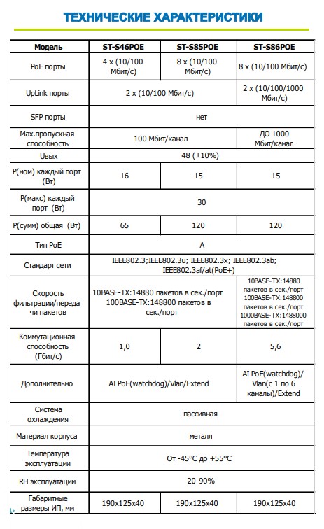ST-S85POE (2M/120W/А) PRO, (версия 4), Switch POE 8-ми портовый для обеспечения проводных сетей напряжением 48В , защита от КЗ, Extend 250м., AI PoE, AI VLAN, Грозозащита, PoE порты: 8 х (10/100 Мбит/с), UpLink порты: 2 х (10/100 Мбит/с), SFP порты: нет, Max.пропускная сп-ть: 100 Мбит/канал, Uвых: 48 (±10%), Р(ном) каждый порт (Вт): 15 Вт, Р(макс) каждый порт (Вт): 30 Вт, Р(сумм) общая (Вт): 120 Вт, Тип РоЕ: А, Коммутационная способность (Гбит/с): 2 Гбит/с, AI PoE(watchdog)/Vlan/Extend, Система охлаждения: пассивная, Активное РОЕ Металл, Температура эксплуатации: От -45°C до +55°C, Габариты изделия, мм.: 190х125х40 мм