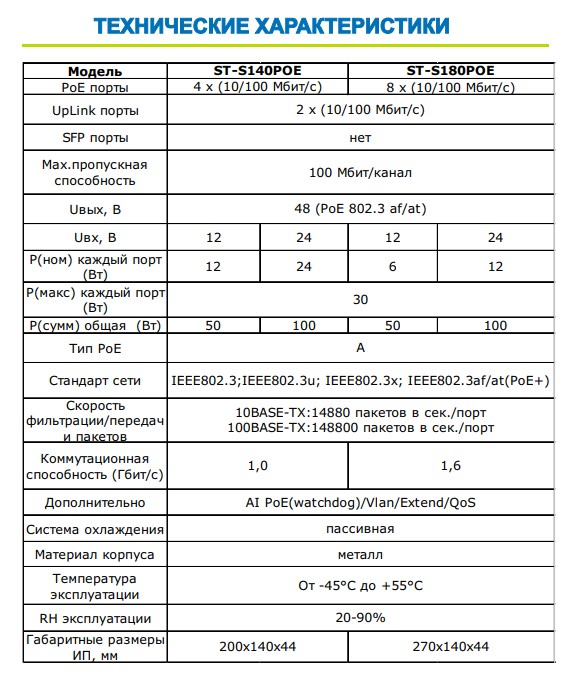 Источник питания ST-S140POE (2М/100W/А) PRO резервируемый , Switch POE 4-х портовый для обеспечения проводных сетей напряжением 48В, защита от КЗ, Extend 250м., AI PoE, AI QoS, AI VLAN, Грозозащита, PoE порты: 4 х (10/100 Мбит/с), UpLink порты: 2 х (10/100 Мбит/с), SFP порты: нет, Max.пропускная сп-ть: 100 Мбит/канал, Uвых: 48 (PoE 802.3 af/at), Р(ном) каждый порт (Вт): 12 Вт (12 В) 24 Вт (24 В), Р(макс) каждый порт (Вт): 30 Вт, Р(сумм) общая (Вт): 50 Вт (12 В) 100 Вт (24 В), Тип РоЕ: А, Коммутационная способность (Гбит/с): 1,0 Гбит/с, AI PoE(watchdog)/Vlan/Extend/QoS, Система охлаждения: пассивная, Металл, Температура эксплуатации: От -45°C до +55°C, Габариты изделия, мм.: 200х140х44 мм.
