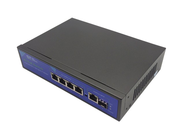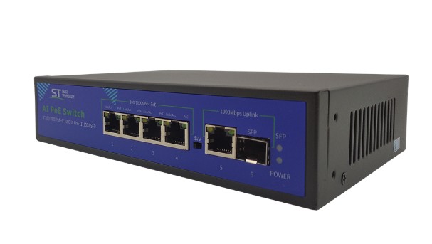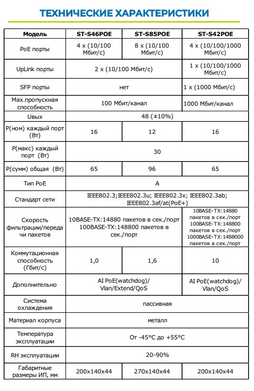 Источник питания ST-S42POE (4G/1G/1S/65W/А) PRO, (версия 2), Switch POE 4-х портовый для обеспечения проводных сетей напряжением 48В, защита от КЗ, AI PoE, AI QoS, AI VLAN, Грозозащита, PoE порты: 4 х (10/100/1000 Мбит/с), UpLink порты: 1 х (10/100/1000 Мбит/с), SFP порты: 1 х (1000 Мбит/с), Max.пропускная сп-ть: 1000 Мбит/канал, Uвых: 48 (±10%), Р(ном) каждый порт (Вт): 16 Вт, Р(макс) каждый порт (Вт): 30 Вт, Р(сумм) общая (Вт): 65 Вт, Тип РоЕ: А, Коммутационная способность (Гбит/с): 10 Гбит/с, AI PoE(watchdog)/Vlan/QoS, Система охлаждения: пассивная, Металл, Температура эксплуатации: От -45°C до +55°C, Габариты изделия, мм.: 200х140х44 мм.