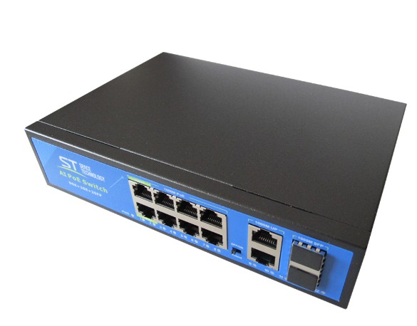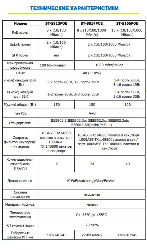 ST-S814POE (8G/2G/2S/150W/АB/2BT) PRO, Switch POE 8-ми портовый для обеспечения проводных сетей напряжением 48В , Защита от КЗ, Extend 250м., AI PoE, AI VLAN, Грозозащита, PoE порты: 8 х (10/100/1000 Мбит/с), UpLink порты: 2 х (10/100/1000 Мбит/с), SFP порты: 2 х (10/100/1000 Мбит/с), Max.пропускная сп-ть: 1000 Мбит/канал, Uвых: 48 (±10%), Р(ном) каждый порт (Вт): 1-2 порты 60Вт, 3-8 порты 19Вт, Р(макс) каждый порт (Вт): 1-2 порты 90Вт, 3-8 порты 30Вт, Р(сумм) общая (Вт): 150 Вт, Тип РоЕ: А+B, Коммутационная способность (Гбит/с): 24 Гбит/с, AI PoE(watchdog)/Vlan/Extend, Система охлаждения: Пассивная, Активное РОЕ Металл, Температура эксплуатации: От -45°C до +55°C, Габариты изделия, мм.: 220х140x45.