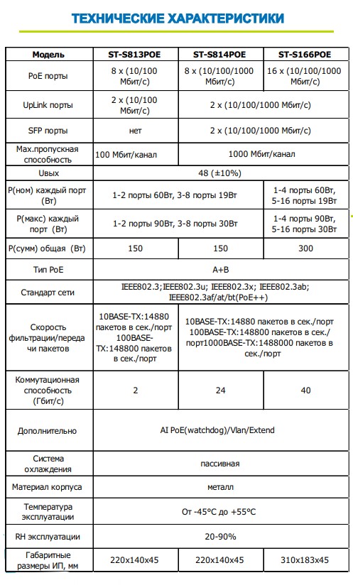 ST-S166POE (16G/2G/2S/300W/АB/4BT) PRO, Switch POE 16-и портовый для обеспечения проводных сетей напряжением 48В , Защита от КЗ, Extend 250м., AI PoE, AI VLAN, Грозозащита, PoE порты: 16 х (10/100/1000 Мбит/с), UpLink порты: 2 х (10/100/1000 Мбит/с), SFP порты: 2 х (10/100/1000 Мбит/с), Max.пропускная сп-ть: 1000 Мбит/канал, Uвых: 48 (±10%), Р(ном) каждый порт (Вт): 1-4 порты 60Вт, 5-16 порты 19Вт, Р(макс) каждый порт (Вт): 1-4 порты 90Вт, 5-16 порты 30Вт, Р(сумм) общая (Вт): 300 Вт, Тип РоЕ: А+B, Коммутационная способность (Гбит/с): 40 Гбит/с, AI PoE(watchdog)/Vlan/Extend, Система охлаждения: Пассивная, Активное РОЕ Металл, Температура эксплуатации: От -45°C до +55°C, Габариты изделия, мм.: 310х183x45.