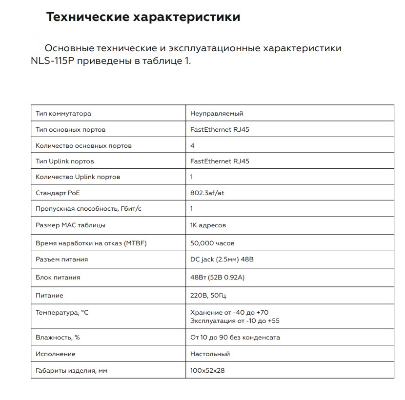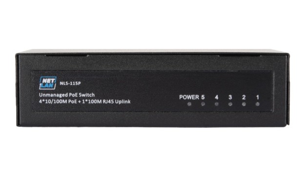 NLS-115P коммутатор неуправляемый NETLAN; 4*10/100Мбит/с PoE (af/at); 1*100Мбит/с RJ45; 1* DC52V/0.92A; PoE бюджет 48W; -10…+50 °С; 100х52х28 мм.