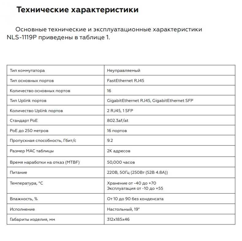 NLS-1119P коммутатор неуправляемый NETLAN; 16*10/100Мбит/с PoE (af/at); 2*10/100/1000Мбит/с RJ45; 1*100/1000Мбит/с SFP; DC52V/4.8A; PoE бюджет 250W; -10…+55 °С; 312х185х46 мм.