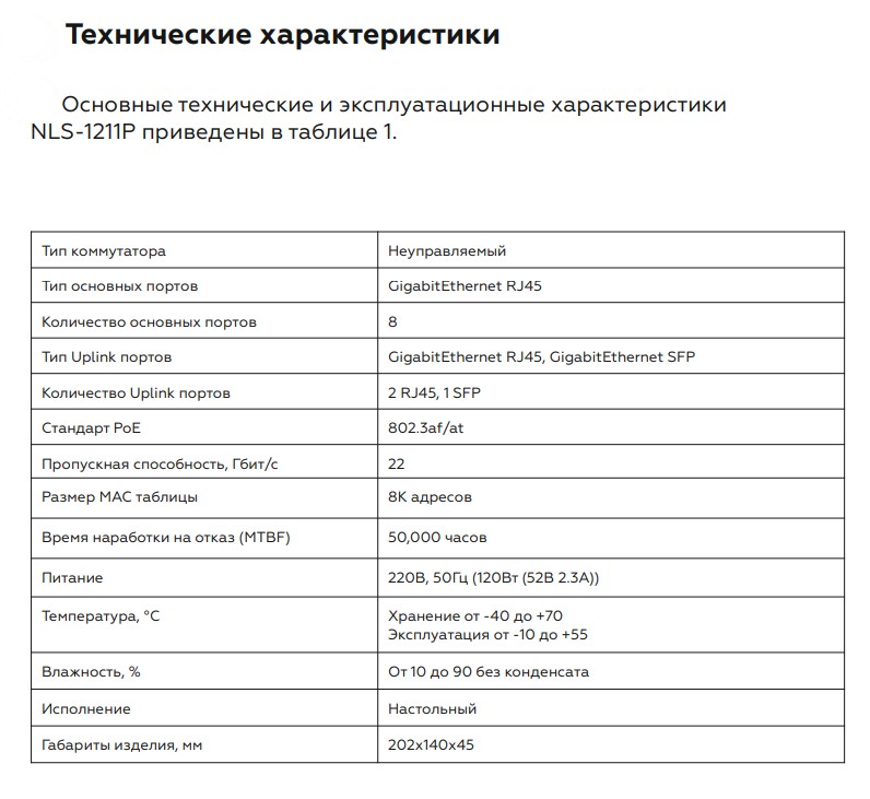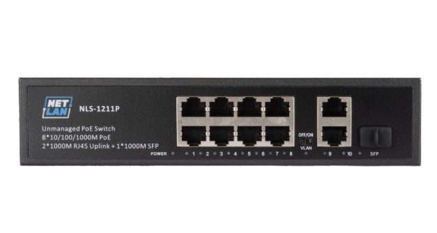NLS-1211P коммутатор неуправляемый NETLAN; 8*10/100/1000Мбит/с PoE (af/at); 2*10/100/1000Мбит/с RJ45; 1*100/1000Мбит/с SFP; DC52V/2.3A; PoE бюджет 120W; -10…+55 °С; 202х140х45 мм.