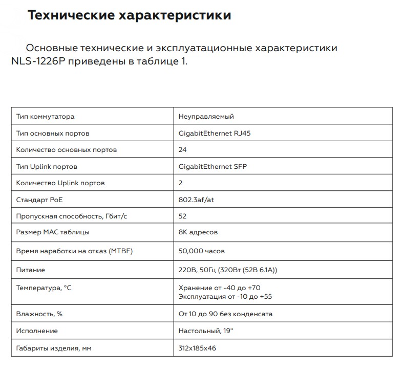 NLS-1226P коммутатор неуправляемый NETLAN; 24*10/100/1000Мбит/с PoE (af/at); 2*10/100/1000Мбит/с SFP; DC52V/6.1A; PoE бюджет 320W; -10…+55 °С; 312х185х46 мм.