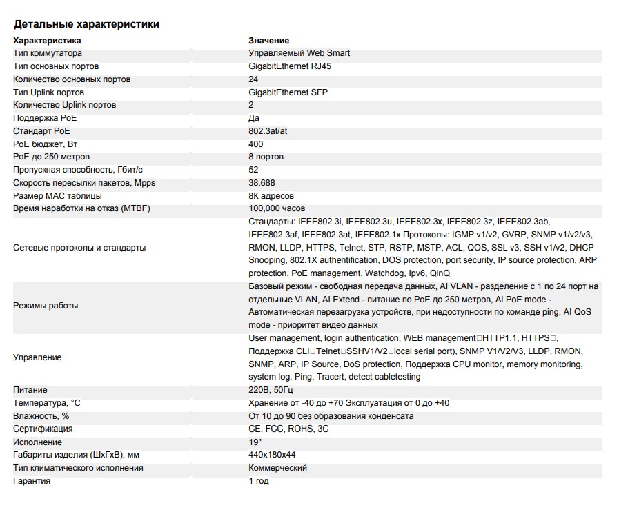 Сетевые протоколы и стандарты: Стандарты: IEEE802.3i, IEEE802.3u, IEEE802.3x, IEEE802.3z, IEEE802.3ab, IEEE802.3af, IEEE802.3at, IEEE802.1x Протоколы: IGMP v1/v2, GVRP, SNMP v1/v2/v3, RMON, LLDP, HTTPS, Telnet, STP, RSTP, MSTP, ACL, QOS, SSL v3, SSH v1/v2, DHCP Snooping, 802.1X authentification, DOS protection, port security, IP source protection, ARP protection, PoE management, Watchdog, Ipv6, QinQ