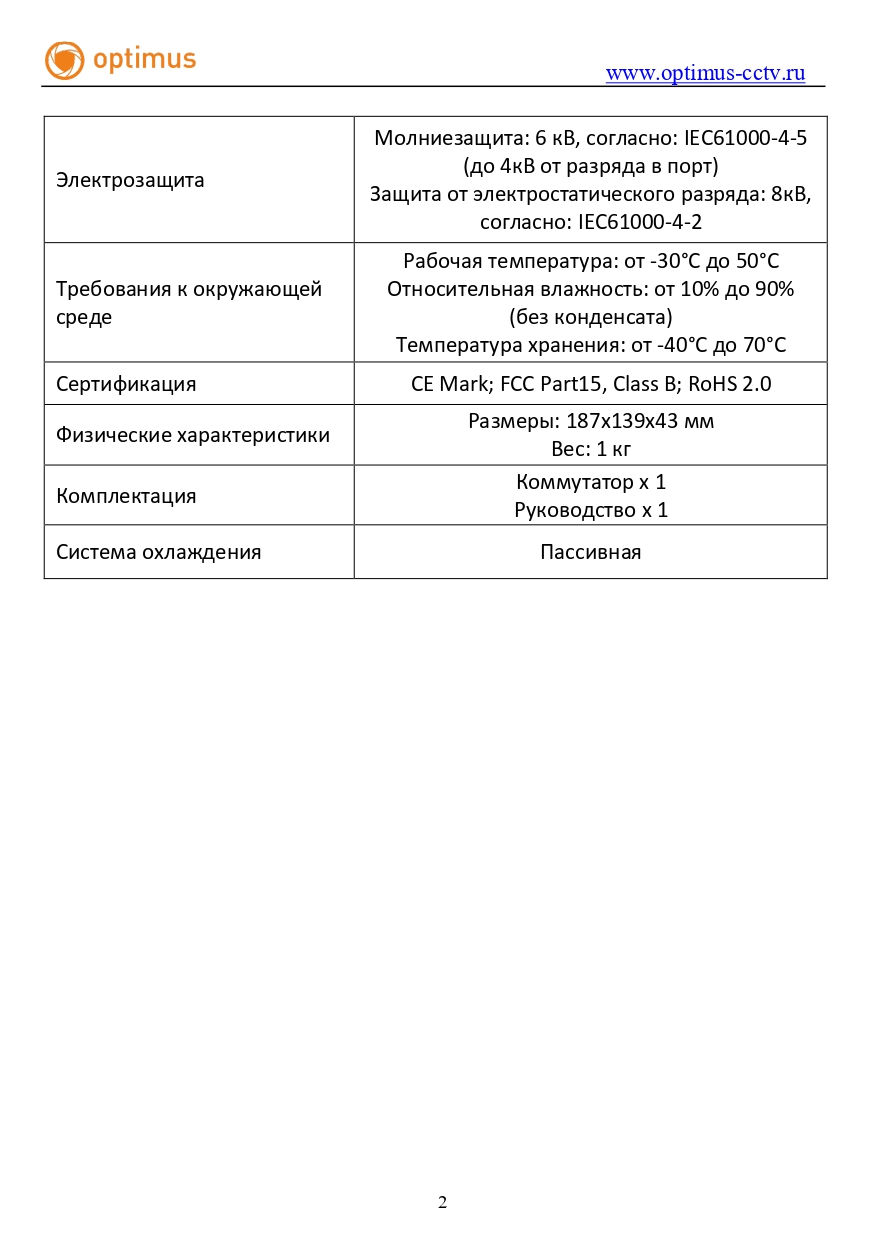 U1i-8F2b/2F неуправляемый PoE-коммутатор Optimus; PoE-порты 1~6: 1/2 (+52В), 3/6 (GND) ≤30Вт, PoE-порты 7~8: 1245 (+53В), 3678 (GND), совместимы с 1/2 (+52В), 3/6 (GND) ≤60Вт; от -30°C до 50°C; 187х139х43 мм; 1 кг.