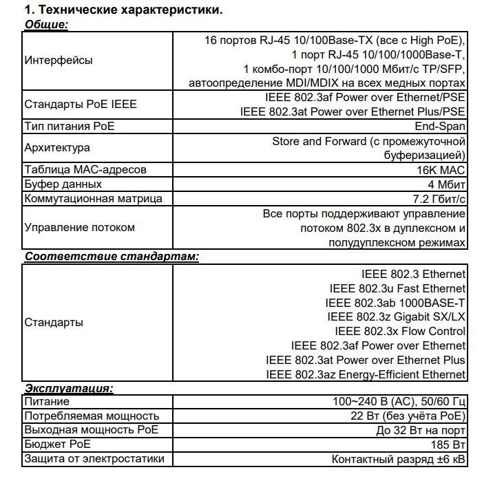 Интерфейсы: 16 портов RJ-45 10/100Base-TX (все с High PoE), 1 порт RJ-45 10/100/1000Base-T, 1 комбо-порт 10/100/1000 Мбит/с TP и 1000 Мбит/с SFP, автоопределение MDI/MDIX на всех медных портах