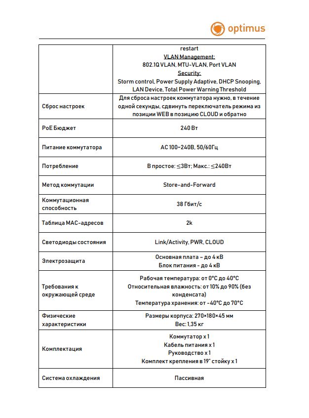 Функции управления: System Management: IP Settings, Change Password, Firmware upgrade, Manage Configuration, Reboot, Port Watchdog, Automatic Port Extension Port Configuration: Port Description, Forced POE, Port Priority, Port Mirroring, Flow Setting, POE Setting, Port Duplex Setting, Port Speed Limit, Port Reboot, Port Timed restart VLAN Management: 802.1Q VLAN, MTU-VLAN, Port VLAN Security: Storm control, Power Supply Adaptive, DHCP Snooping, LAN Device, Total Power Warning Threshold