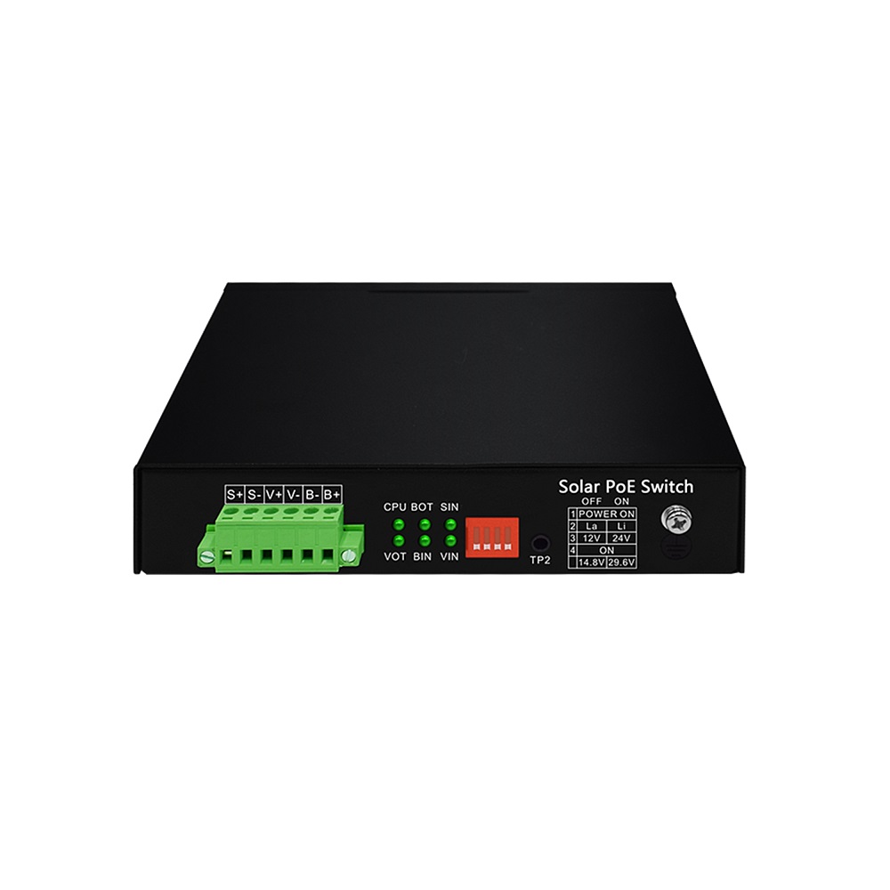 Коммутатор WI-PS306GF-UPS v3 оснащен контроллером питания солнечных панелей, контроллером питания аккумуляторной батареи с функцией ИБП, 6 портами, из которых 5 х 1000Base-T поддерживают технологию PoE и 1 SFP.