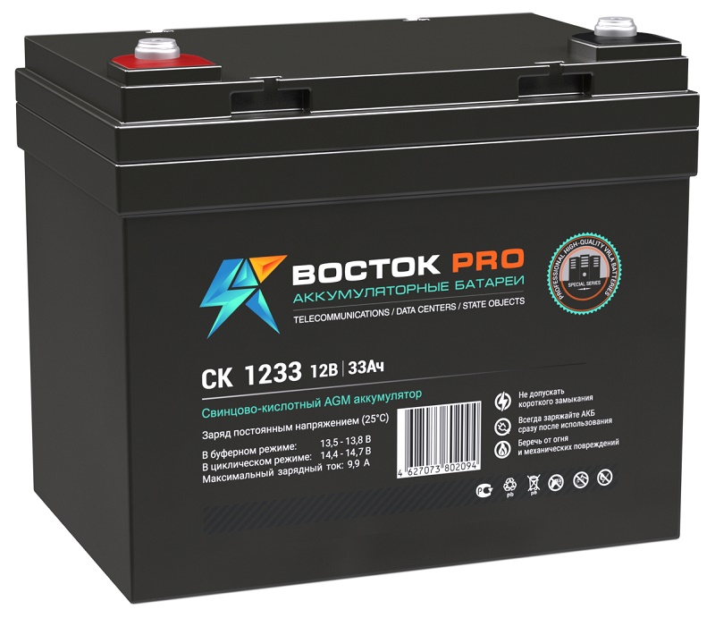 Свинцово-кислотные аккумуляторы ВОСТОК серии CK предназначены для использования в системах бесперебойного питания, резервного энергоснабжения, автономных энергосистемах. Изготовлены по AGM технологии (электролит, абсорбированный в стекловолоконном сепараторе), являются герметизированными и необслуживаемыми, со сроком службы в буферном режиме 10 лет (от 5 до 26 Ач – 5 лет). Обладают высокими разрядными и эксплуатационными характеристиками благодаря использованию в составе электролита и намазной пасты специальных добавок, препятствующих коррозии и замедляющих процесс старения.