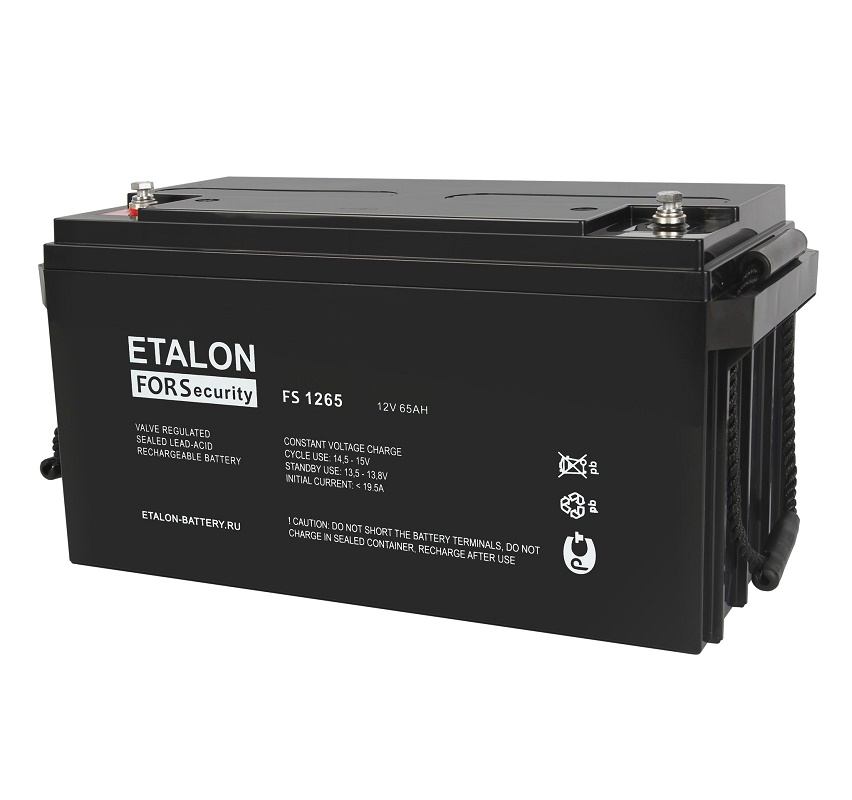 Аккумулятор ETALON FS 1265 герметичный свинцово-кислотный (12 В/65 Ач); напряжение 12 В; ёмкость 65 Ач; -15...+50°C; 350*166*179 мм; 19,2 кг.