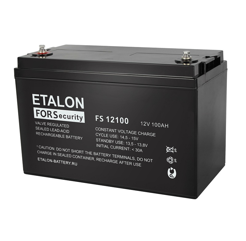 Аккумулятор ETALON FS 12100 герметичный свинцово-кислотный (12 В/100 Ач); напряжение 12 В; ёмкость 100 Ач; -15...+50°C; 330*171*220 мм; 27,5 кг.