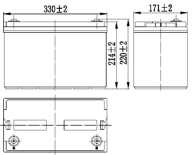 Аккумулятор 12 В 100 Ач, габариты 330*171*220 мм.