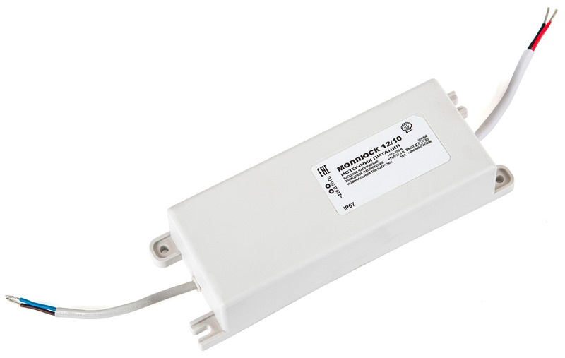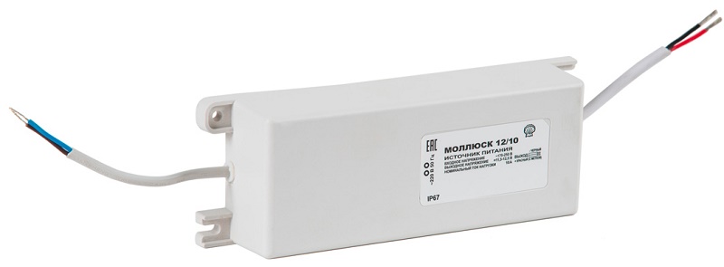Моллюск-12/10 блок питания; защита выхода от КЗ и перегрузки; прочность изоляции 3 кВ; проушины для крепления; корпус IP67; -30…+40 °С; 70х205х40 мм; 0,8 кг.