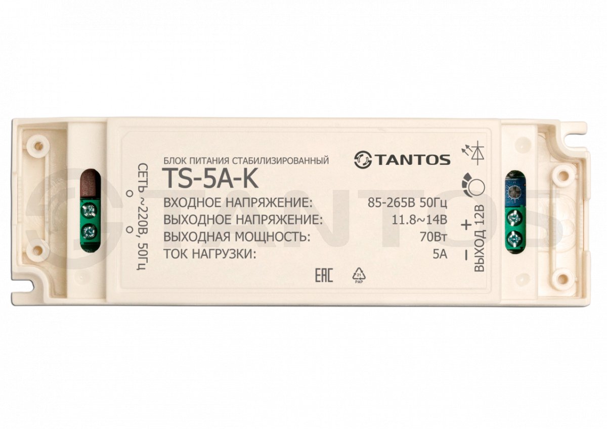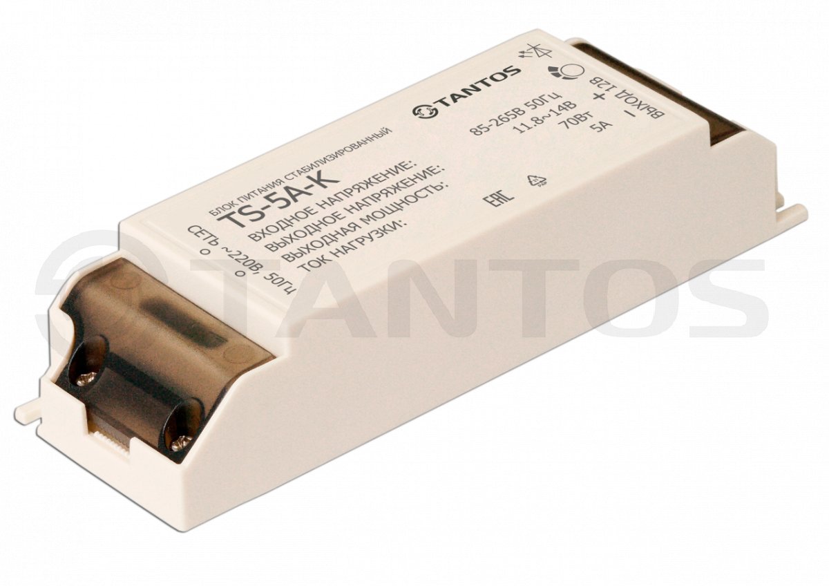 TS-5A-K блок питания Tantos; 12B 5А; источник электропитания стабилизированный; пластиковй корпус; 88 Вт; IP 21; -15...+50°С; 140х45х28 мм; 0,14 кг.