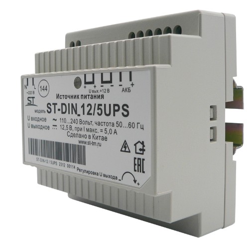 ST-DIN 12/5UPS, Стабилизированный источник питания на DIN-рейке с функцией подключения АКБ для питания аппаратуры напряжением 12В, Ток нагрузки рабочий/максимальный: 5,0А, Мощность по цепи нагрузки 12 Вольт (при максимальном выходном токе: 60Вт, Выходное напряжение, номинальное: 12,5В, Максимальный ток заряда АКБ: 0,7А, Ток ограничения выхода при коротком замыкании нагрузки: >6,0А, Защита выхода от КЗ с восстановлением нормального режима работы после устранения проблемы,защита АКБ от глубокого разряда,регулировка выходного напряжения, Емкость АКБ: рекомендуемая емкость подключаемого АКБ (напряжением 12 Вольт с электрической емкостью 7 или 12 А/ч), Пластик, Температура эксплуатации: -10...+45°C.