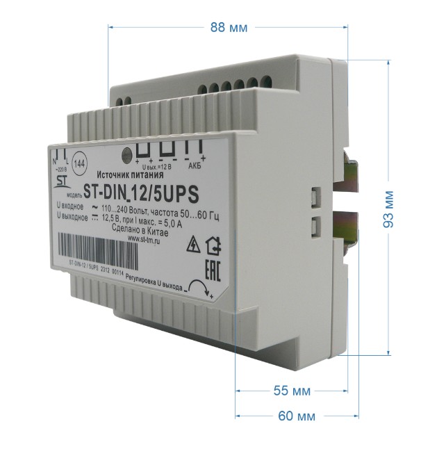 ST-DIN 12/5UPS стабилизированный источник питания на DIN-рейке с функцией подключения АКБ Space Technology; U-вх.220 В, U-вых.11.2…14.2 В (регулируется), I-вых.5 А; под внешний АКБ 12 7 или 12 А·ч; защита от короткого замыкания, защита АКБ; t-раб.-10…+45°С, 92х87х54.5 мм.