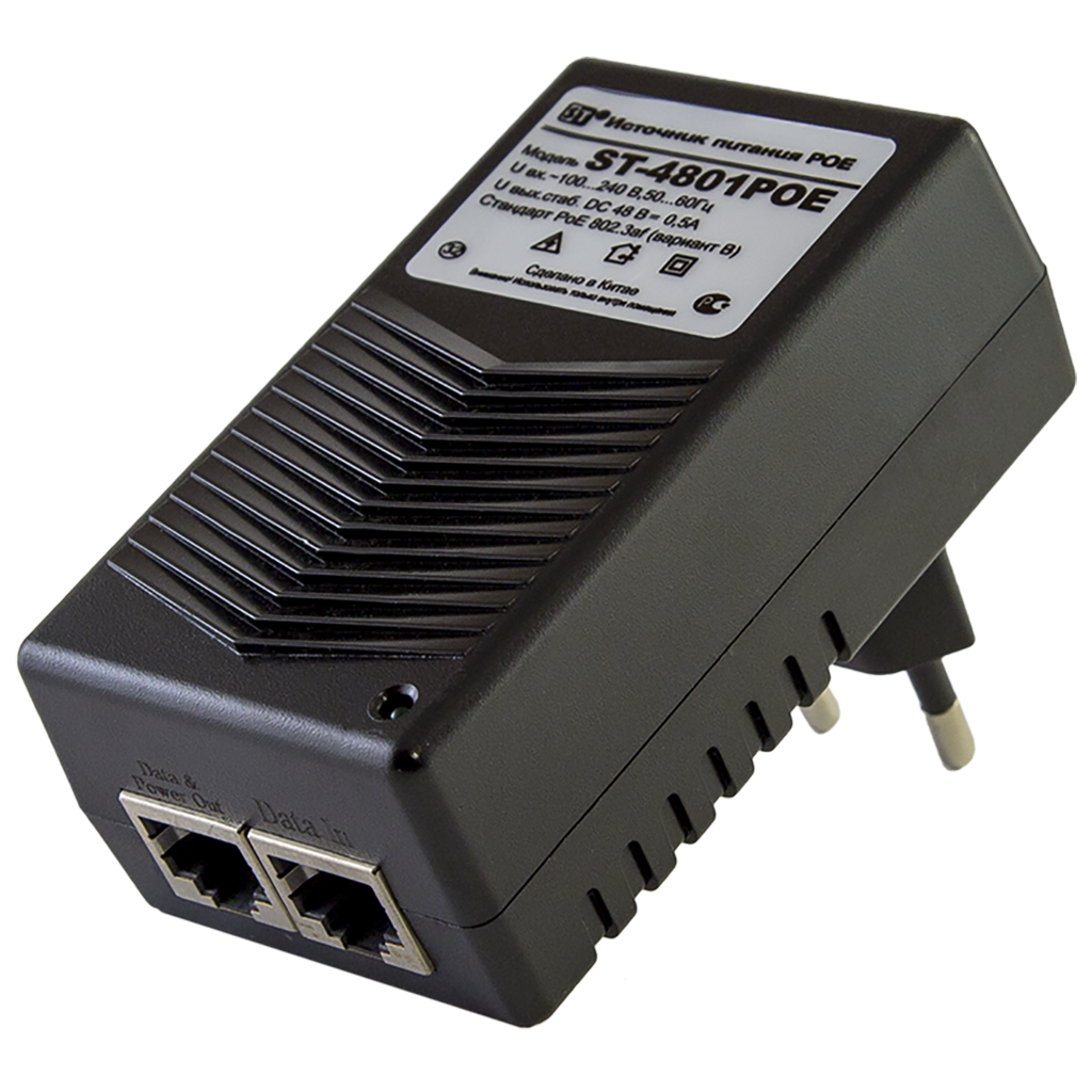 ST-4801 POE, Источник питания POE однопортовый для обеспечения проводных сетей напряжением 48В., Ток нагрузки рабочий/максимальный: 0,5А, Входное напряжение: 100-240 Вольт перем.тока, Выходное напряжение, номинальное: 48Вольт 24 Ватт всего 1-н канал (порт), Защита от КЗ, защита по току/напряжению от перегрузки - 115% -150% от номинала, Тип разъема: данные/данные+питание RJ45, Соответствие стандартам: поддерживает стандарт IEEE 802.3af(вар.B), Пластик, Температура эксплуатации: -10...+40°C, Габариты изделия, мм.: 84х47х64мм.
