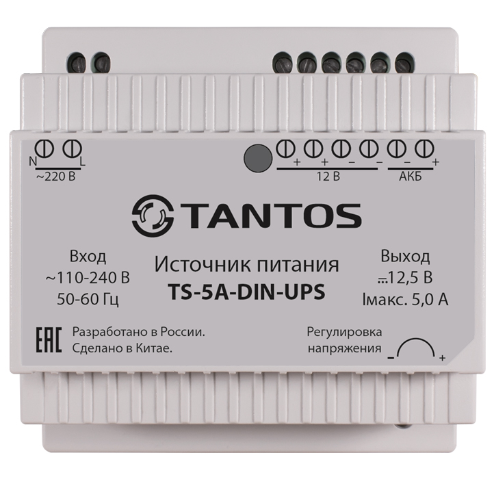 TS-5A-DIN-UPS источник вторичного питания на DIN-рейку резервированный Tantos; 12В, 5А; защита от короткого замыкания; индикация рабочих режимов; резервное электропитание; -10...+45°C; 93×87×55 мм; 0.3 кг.