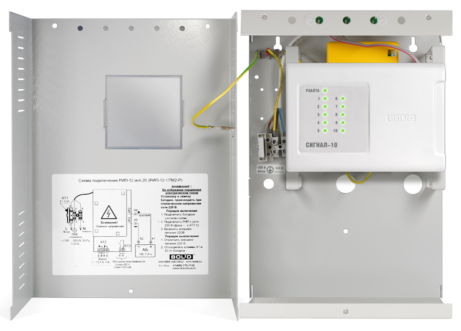 РИП-12 исп. 20 (РИП-12-1/7М2-Р) резервированный источник питания Болид; 12В; 1А; под АКБ 7 Ач; защита от переполюсовки, КЗ, перегрузки по току, превышения напряжения; световая индикация; звуковая сигнализация; IP30; -10...+40°С; металл; 200×280×100 мм; 4,5 кг с АБ.