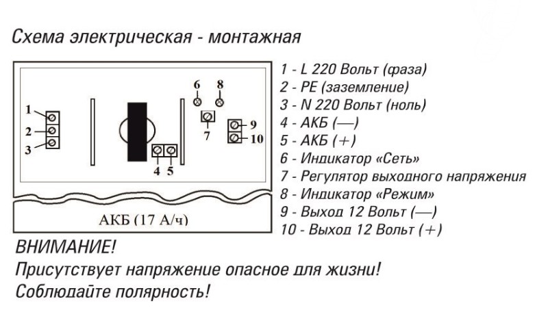 Комплектация: Источник питания,крепеж,кабель с двумя клеммами для подключения внешнего АКБ,переходник для подключения АКБ 17 А/ч,паспорт, коробка.