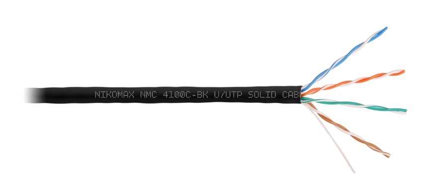 NMC 4100C-BK кабель NIKOMAX; U/UTP 4 пары; Кат.5e (Класс D); тест по ISO/IEC; 100МГц одножильный; BC (чистая медь); 24AWG (0,51мм); полимерный материал нг(А)-HF; внутренний/внешний; черный; 305м