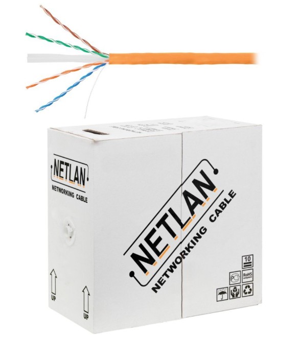 EC-UU004-6-LSZH-OR кабель NETLAN; U/UTP 4 пары; Кат.6 (Класс E); 250МГц; одножильный; BC (чистая медь); внутренний; LSZH нг(B)-HF; оранжевый; диаметр проводника 0.50 мм; -20…+60 °С; 305м.