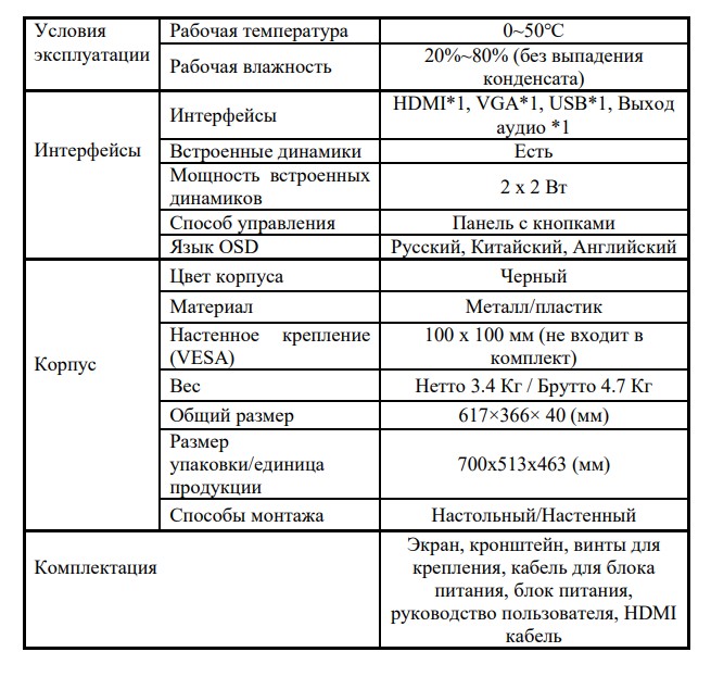 Интерфейс: HDMI*1, VGA*1, USB*1, Выход аудио *1
