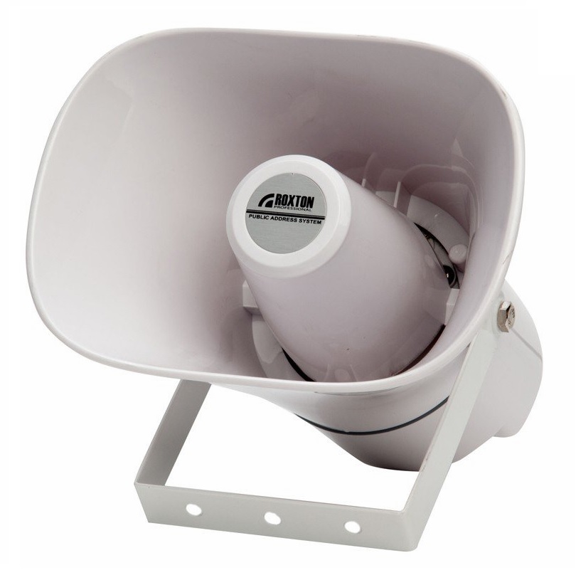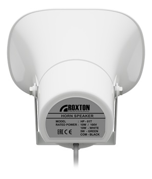 Рупорный громкоговоритель ROXTON HP-01T мощностью 10 Вт сочетает в себе хорошие акустические характеристики и удобство монтажа, что делает его незаменимым при построении систем речевого оповещения и музыкальной трансляции складов, вокзалов, парков и спортивных площадок. Выполненный из всепогодного ABC-пластика, громкоговоритель обеспечивает высокое звуковое давление вкупе с высокой направленностью звукового излучения. Громкоговоритель оборудован специальным П-образным металлический кронштейном, значительно облегчающим монтаж на различные поверхности. Встроенный трансформатор с отводами позволяет устанавливать значения мощности 5 или 10 Вт. Отличительными особенностями ROXTON HP-01 является высокая направленность излучения звуковых волн с максимальным углом раскрытия 90° на частоте 1кГц, а так же уличным исполнением с высокой степенью защиты IP66.