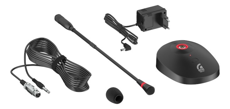 Устройство комплектуется микрофонным шнуром, а также дополнительным адаптером питания. Микрофон может питаться как от адаптера, так и от двух AA батареек (1.5 В), размещаемых в нижней части подставки, под крышкой.