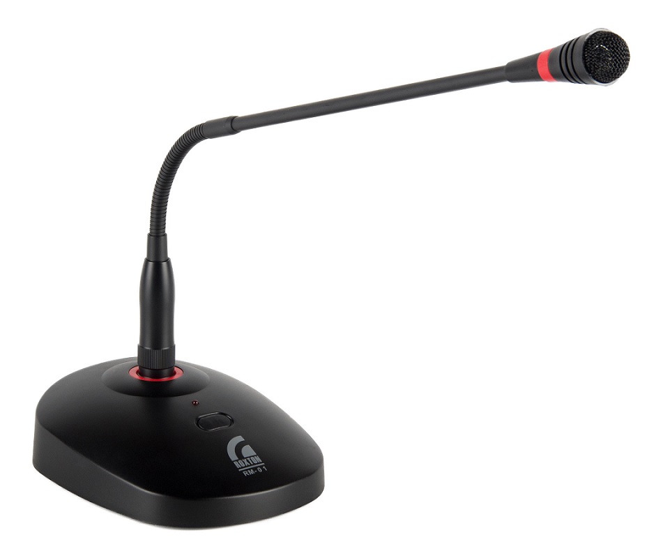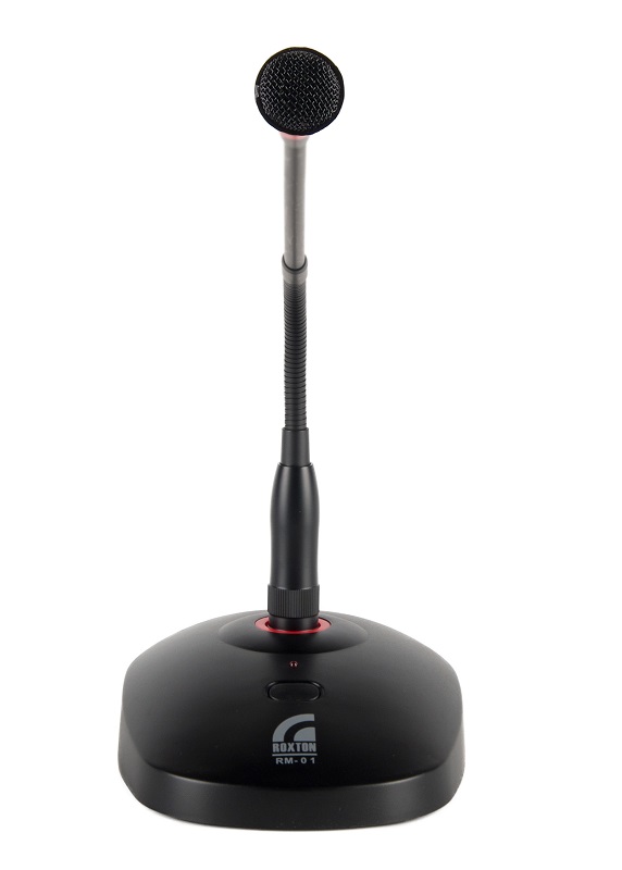 Настольный микрофон ROXTON RM-01 предназначен для подачи речевых объявлений. Включение/отключение микрофона осуществляется кнопкой, размещенной на передней части корпуса подставки. При включении микрофона загорается индикатор, размещенный над кнопкой включения.