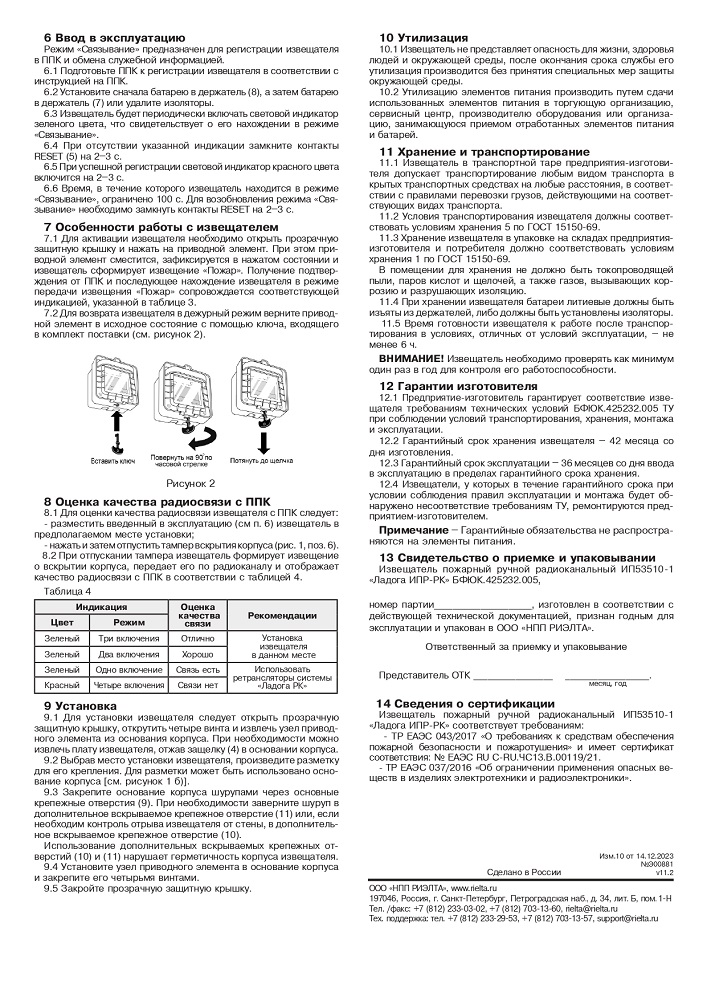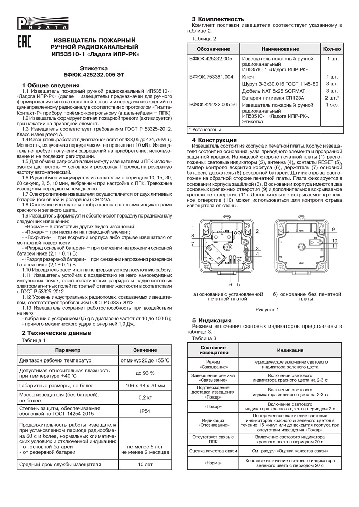 Ладога ИПР-РК (ИП53510-1) извещатель пожарный ручной радиоканальный Риэлта; от 433,05 до 434,79 МГц; IP54; CR123A-2 шт.; от -20 °С до +55 °С; 106х98х70 мм.