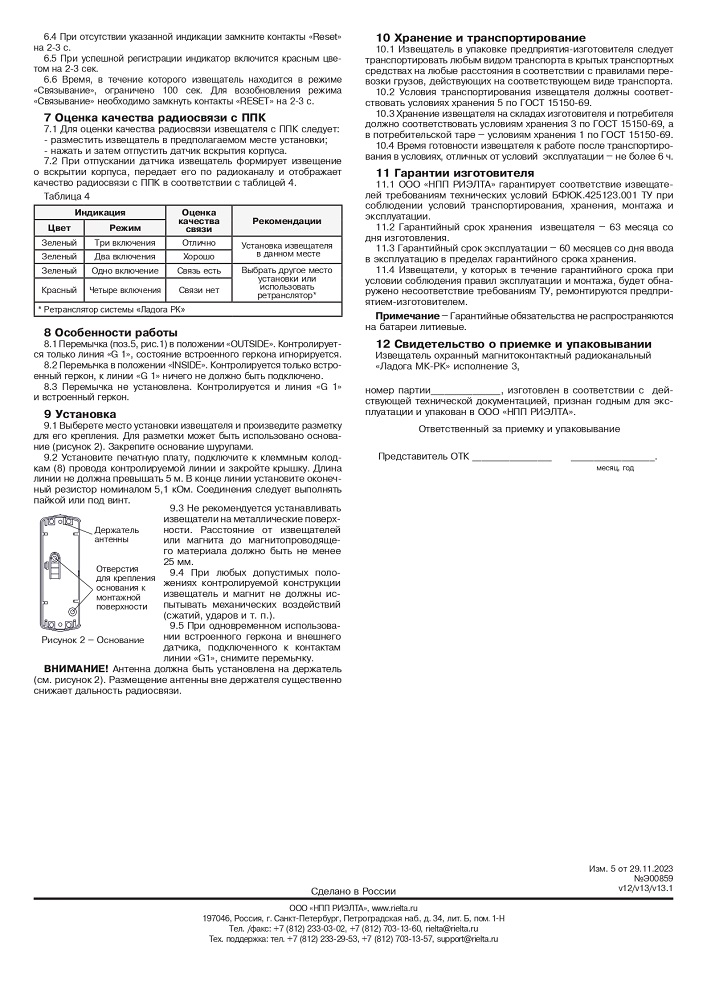 Информативность: «Норма», «Тревога», «Вскрытие», «Разряд батареи».