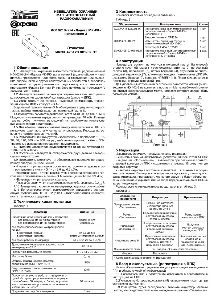 Ладога МК-РК исп.3 (ИО10210-2/4) извещатель охранный точечный магнитоконтактный радиоканальный Риэлта; от 433,05 до 434,79 МГц; CR123A; IP30; от-20°С до +55°С; 112x41x32 мм.