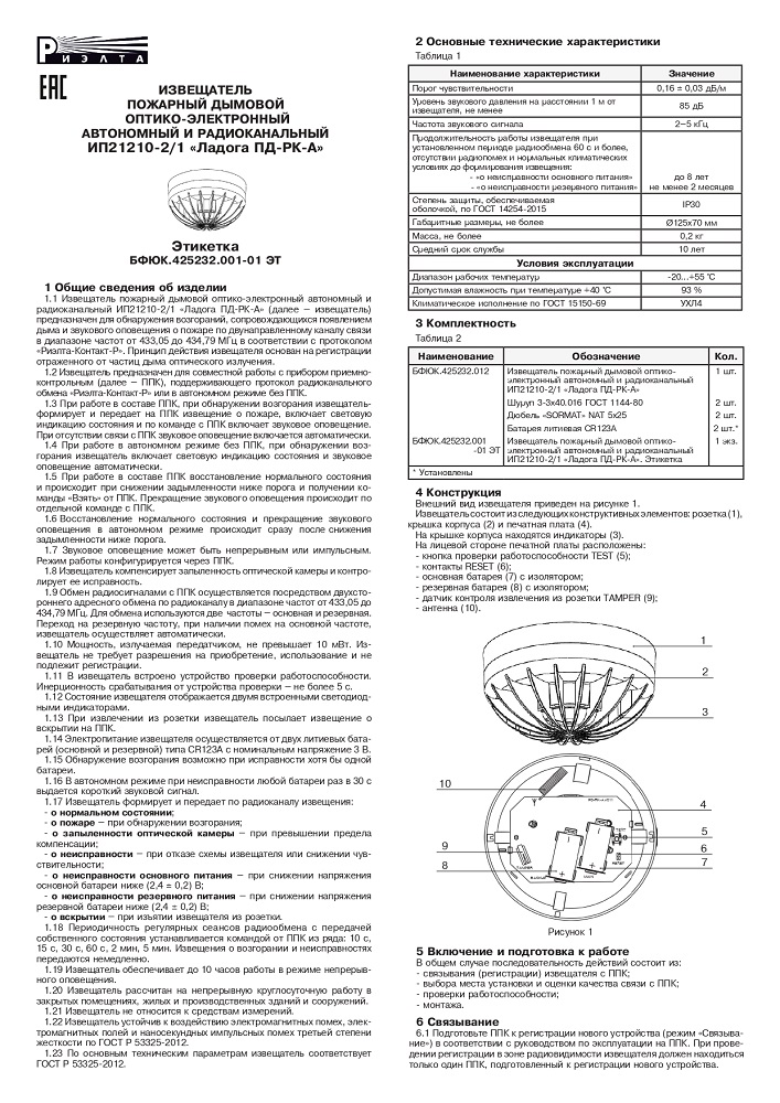 Ладога ПД-РК-А (ИП 21210-2/1) извещатель пожарный дымовой радиоканальный автономный Риэлта; от 433,05 до 434,79 МГц; CR123A 2 шт.; IP30; 0,16 ± 0,03 дБ/м; от -20°С до +55°С; 125х70 мм.