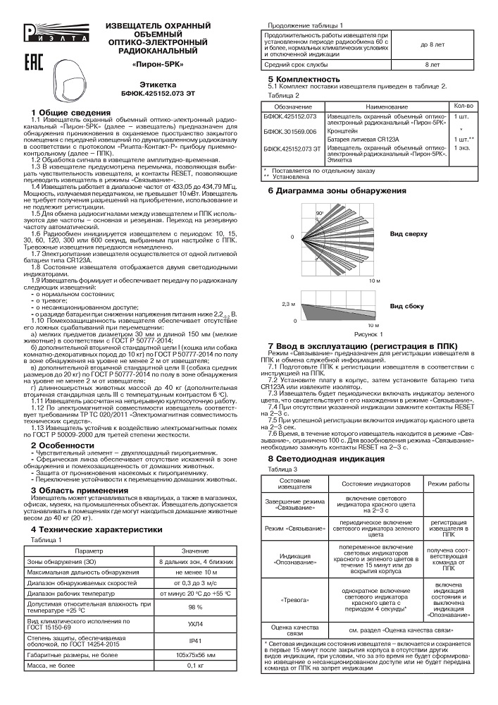 Пирон-5РК извещатель охранный объемный оптико-электронный радиоканальный Риэлта; устойчивость к перемещению животных: 10 кг, 20 кг, 40 кг; высота установки: 2,3 метра; от 433,05 до 434,79 МГц; СR123A; от -20 °С до +55 °С; IP41; 105х75х56 мм.
