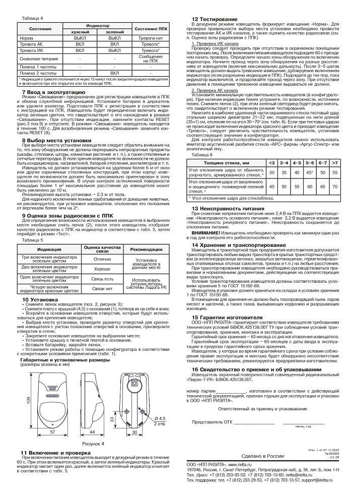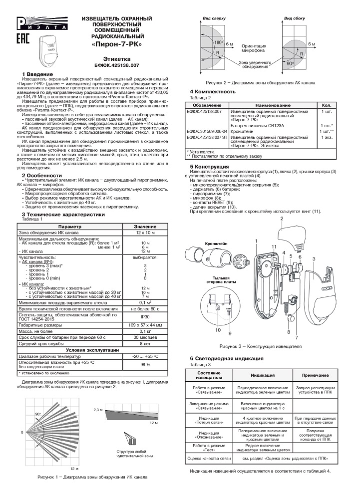 Пирон-7-РК извещатель охранный поверхностный совмещенный радиоканальный Риэлта; максимальная дальность обнаружения по АК/ИК каналу 10 м/12 м; минимальная площадь охраняемого стекла 0,1 м2; высота установки 2,3 м; максимальная дальность обнаружения 12 м; 433,05 до 434,79 МГц; СR123A; IP30; от -20 °С до +55 °С; 109х57х44 мм.
