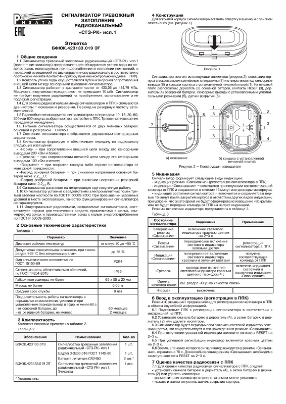 СТЗ-РК исп.1 сигнализатор тревожный затопления радиоканальный Риэлта; от 433,05 до 434,79 МГц; CR2450-2 шт; от -20 °С до +55 °С; IP65; 65x55x20 мм.
