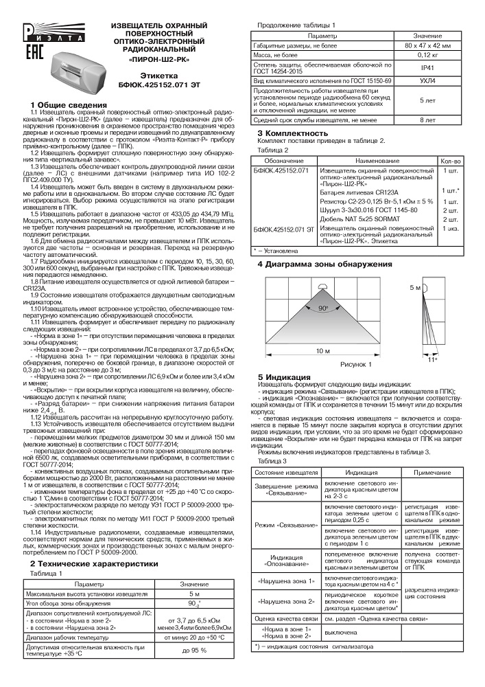 Предназначен для обнаружения проникновения в охраняемое пространство закрытого помещения через дверные и оконные проемы и передачи извещений о своем состоянии по беспроводному двунаправленному каналу связи в протоколе «Риэлта-Контакт-Р» прибору приемно-контрольному.