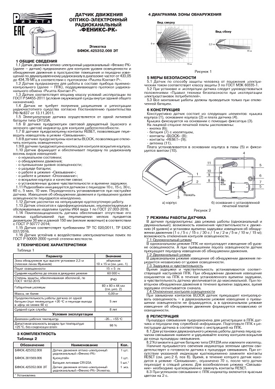 Феникс-РК датчик движения оптико-электронный радиоканальный Риэлта; высота установки от 2,3 метра; максимальная дальность обнаружения 15 метров; от -20 °С до +55 °С; СR123A; IP40; 80х80х44 мм.