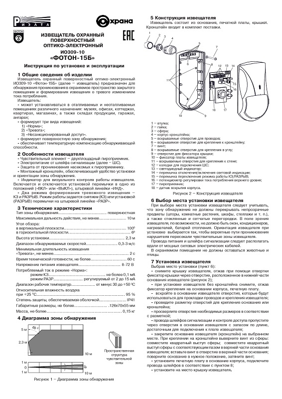 Извещатель охранный поверхностный оптико-электронный ИО309-10 «Фотон-15Б».