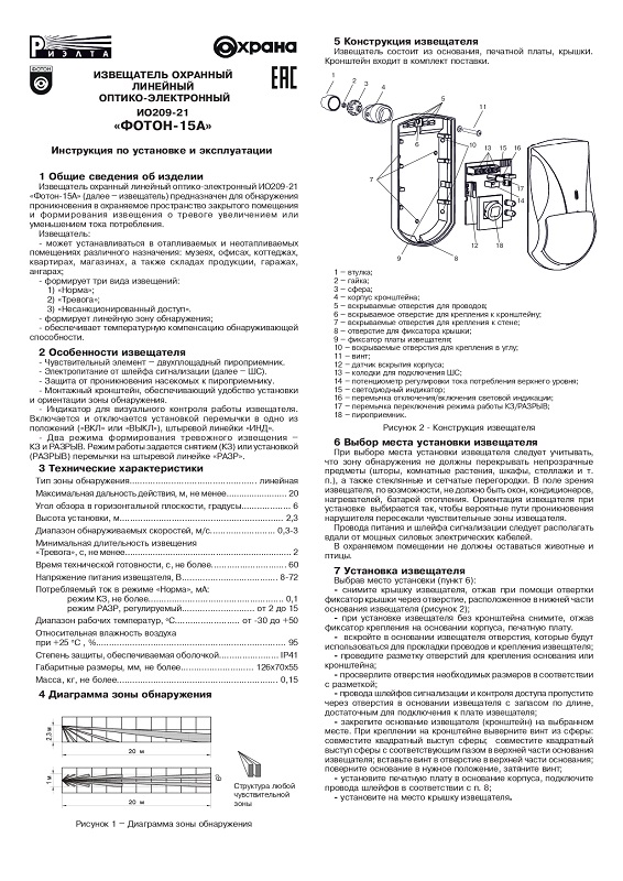 Фотон-15А (ИО209-21) извещатель охранный линейный оптико-электронный Риэлта; высота установки 2,3 метра; максимальная дальность обнаружения 20 метров; IP41; от -30 °С до +50 °С; 126х70х55 мм.