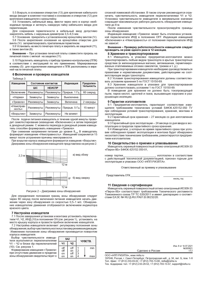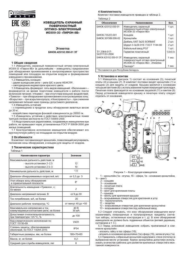Извещатель охранный поверхностный оптико-электронный ИО309-33 «Пирон-8Б».