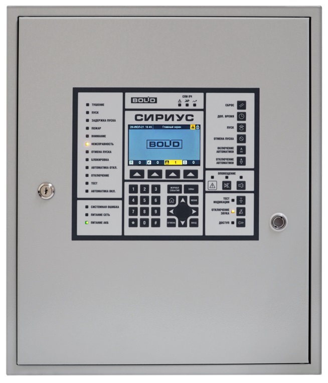 ППКУП "Сириус" прибор приемно-контрольный и управления пожарный Болид; журнал на 65000 событий; интерфейс RS-485; IР 41; 0 до +40 С; 500*425*110 мм; 6,5 кг (без АКБ), 16 кг (с АКБ).