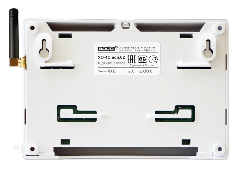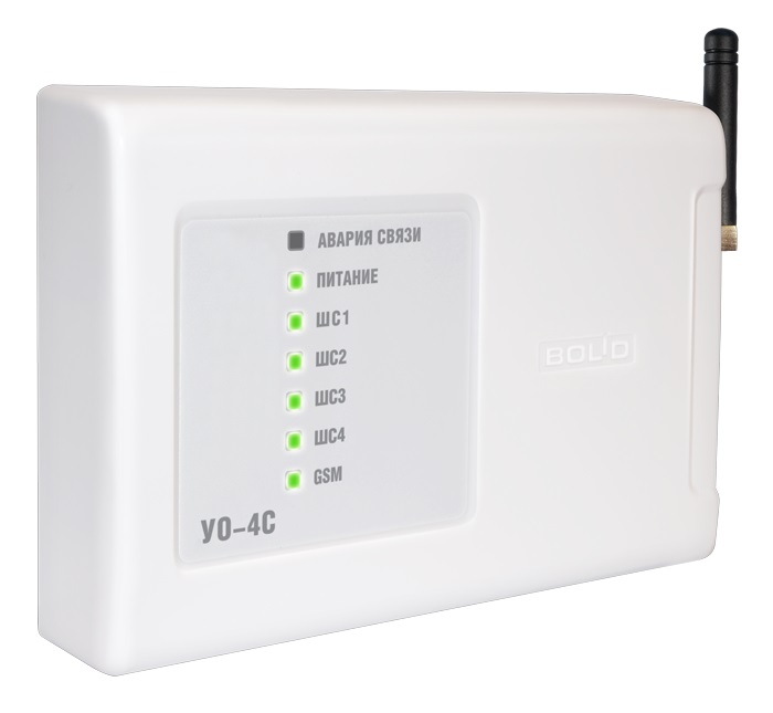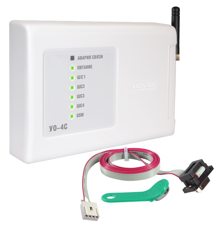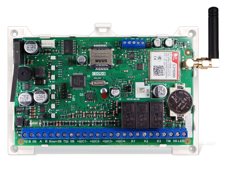 УО-4С исп.02 устройство оконечное системы передачи извещений по каналам сотовой связи GSM Болид; на 5 телефонных номеров; 2 SIM карты; 4 ШС; управление 3-мя исполнительными устройствами; 1 вход Touch Memory (до16 ключей); питание постоянный ток 12В, выход сирены; IP20; -30...+50°С; 156х107х39 мм; 0,03 кг.