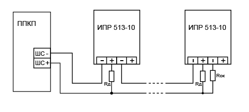 ИПР 513-10 - питание и передача сигнала «Пожар» осуществляются по двухпроводному шлейфу сигнализации (ШС) и сопровождается включением оптического индикатора при срабатывании ИПР. ИПР 513-10 предназначен для работы с любыми приемно-контрольными приборами, обеспечивающими напряжение питания в шлейфе сигнализации в диапазоне от 9 до 30 В и воспринимающими сигнал сработки ИПР в виде скачкообразного уменьшения внутреннего сопротивления извещателя в прямой полярности до величины не более 500 Ом.