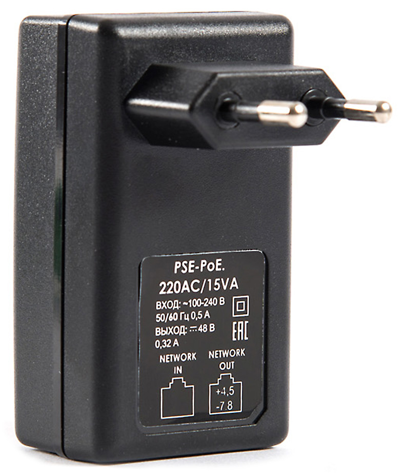 PSE-PoE.220AC/15VA инжектор; PoE IEEE 802.3af; 10/100 Мбит/с; выходное напряжение 48-48,5 В; напряжение питающей сети 100-250 В; IP20; 15,4 Вт; 77,5х45,5х68,5 мм; 0…+40°С; 0,11 кг.