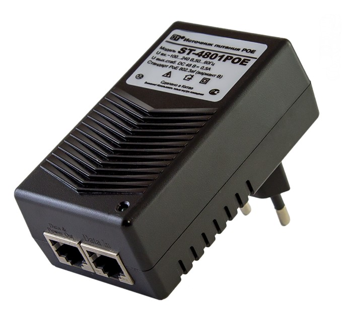 ST-4801 POE источник питания POE однопортовый Space Technology; 48В, 24 Вт; защита от КЗ; 2хRJ45; IEEE 802.3at(вар.B); -10...+40°C; 83х47х68 мм; 0,16 кг.