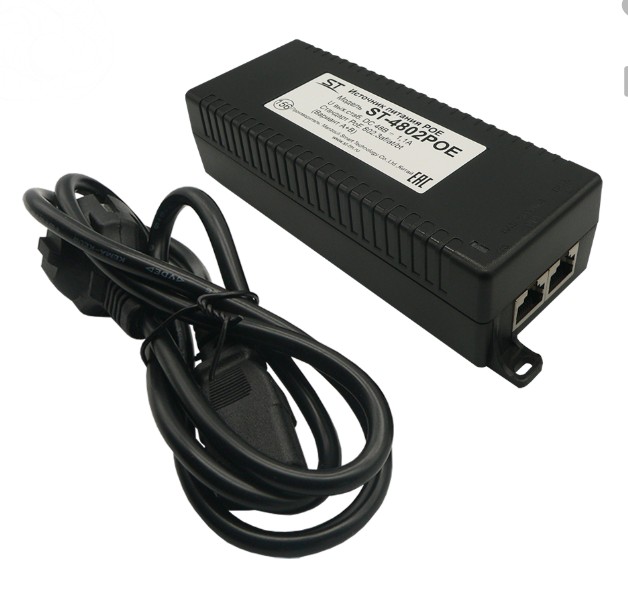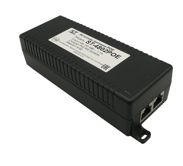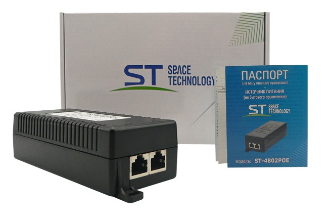 ST-4802POE источник питания POE однопортовый Space Technology; ток нагрузки рабочий/максимальный 1,1А; входное напряжение 110-240 Вольт; номинальное 48 Вольт 60 Ватт; RJ45; мax.пропускная способность 10/100/1000 Mb; макс. мощность PoE на один порт 15,4Вт (IEEE 802.3af),30Вт (IEEE 802.3at), 60Вт (IEEE 802.3bt); вариант работы А+В; пластик; от -10°C до +55°C; 167*57*40 мм.